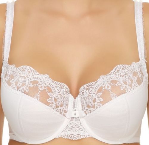 Бюстгальтер Lauma Lingerie арт. 22H41 с полудублированными чашками на каркасах и стане. В основе чашки конструкция из трёх деталей с тройным прямым диагональным членением. Верхняя деталь чашки из вышитого кружева, нижние из эластичного сетчатого полотна с лёгкой драпировкой. Спереди облегчённая конструкция без стана. Боковые детали стана из функционального сетчатого полотна облегчённой конструкции с прямым верхним срезом. Бюстгальтер дополнен атласным бантиком, маленькие бантики на местах соединения чашек с бретелями.