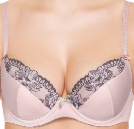Бюстгальтер Lauma Lingerie арт. 44H10 “пуш-ап” на стане и каркасах. В основе чашки конструкция из трёх деталей. Чашки на дубляже с хлопком, с вкладышами. Нижние детали чашки и стан из микроволокна, верхние детали чашки из вышитого кружева. Бюстгальтер дополнен сатиновым бантиком, маленькие бантики на местах соединения чашек с бретелями.