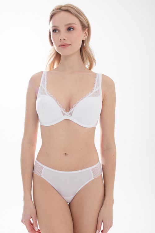Бюстгальтер женский Milavitsa арт.120192 Бюстгальтер с формованной чашкой и встроенным (не съемный) пуш-апом, на каркасе. В данной модели не съемные бретели. Бюстгальтер выполнен из эластичного кружевного полотна. Бретели декорированы кружевным полотном, которое плавно переходит от чашки бюстгальтера к бретели. Используется четырехрядная застежка, что позволяет идеально отрегулировать объем бюстгальтера. Бюстгальтер с формованными чашками создает округлую форму груди.