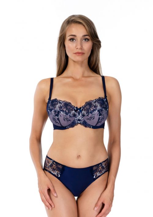Бюстгальтер женский_Lauma Lingerie арт.67K20 с мягкими чашками на каркасах и стане. В основе чашки конструкция из трёх деталей с прямым диагональным членением и боковой корректирующей деталью чашки. Чашки из вышитого кружева. Нижние детали чашки на подкладке из хлопка. Верхняя деталь чашки на тонкой подкладке. Боковая корректирующая деталь из эластичного полотна на дубляже. Боковые детали стана из эластичного полотна, в размерах 85-100 АВС и DEFG из двух слоёв полотна. Бюстгальтер дополнен сатиновым бантиком с жемчужиной, маленькие бантики на местах соединения чашек с бретелями.